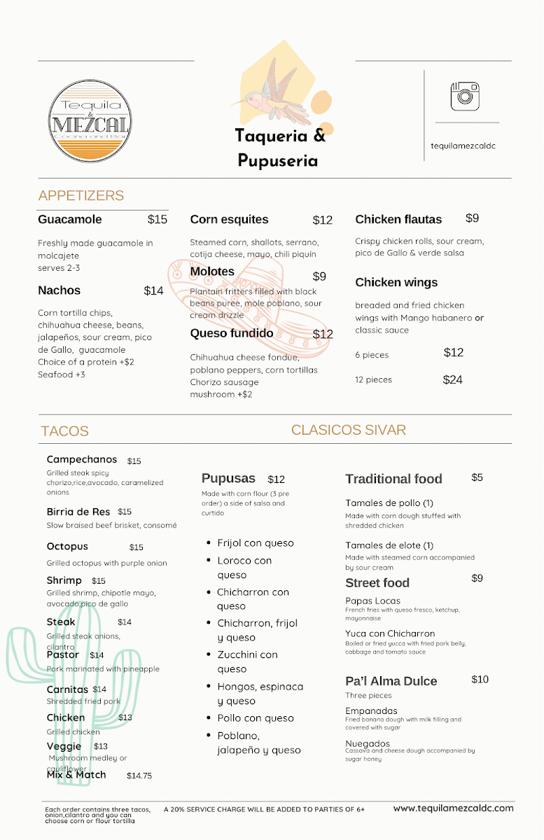 Welcome to Tequila & Mezcal, a vibrant culinary gem located in the heart of Washington, DC. This delightful restaurant captures the essence of Mexican cuisine while giving a special nod to the rich flavors of tequila and mezcal. With a menu that highlights classic offerings, you'll find authentic pupusas and mouthwatering tacos, expertly crafted to celebrate every bite.